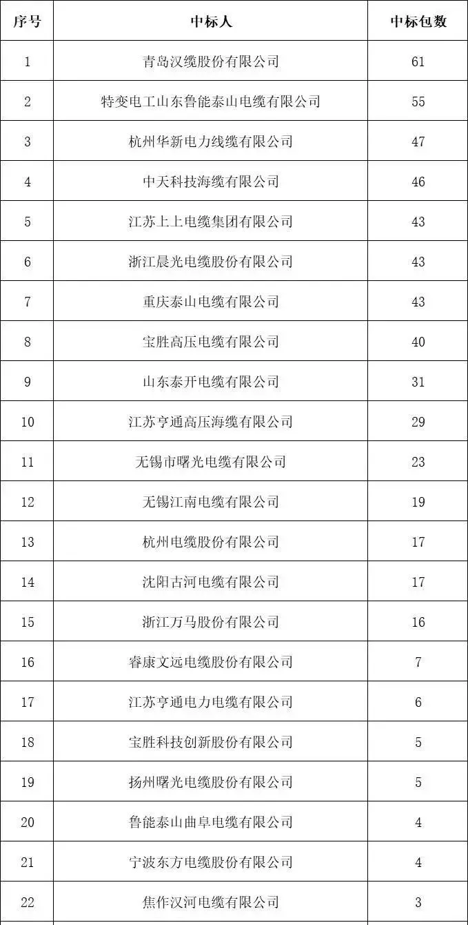 國網2018年電力電纜企業中標榜單,漢纜股份再次居首!