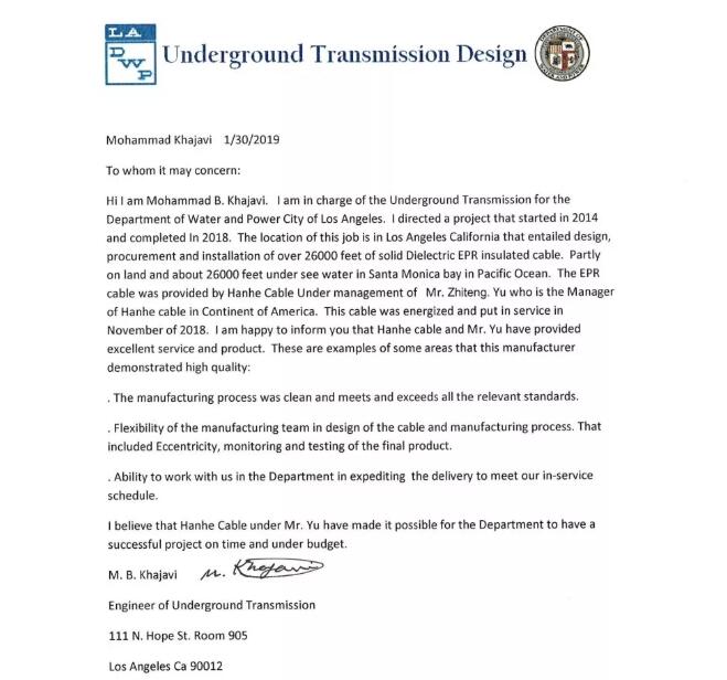 新春伊始,美國洛杉磯直流海纜項目順利完成交接試驗,并正式運行。此線纜將服務于加利福尼亞地區千萬人口。 基于我司在此項目中做出的突出貢獻, 業主及施工方特此以書信的形式對漢纜進行表彰與感謝。