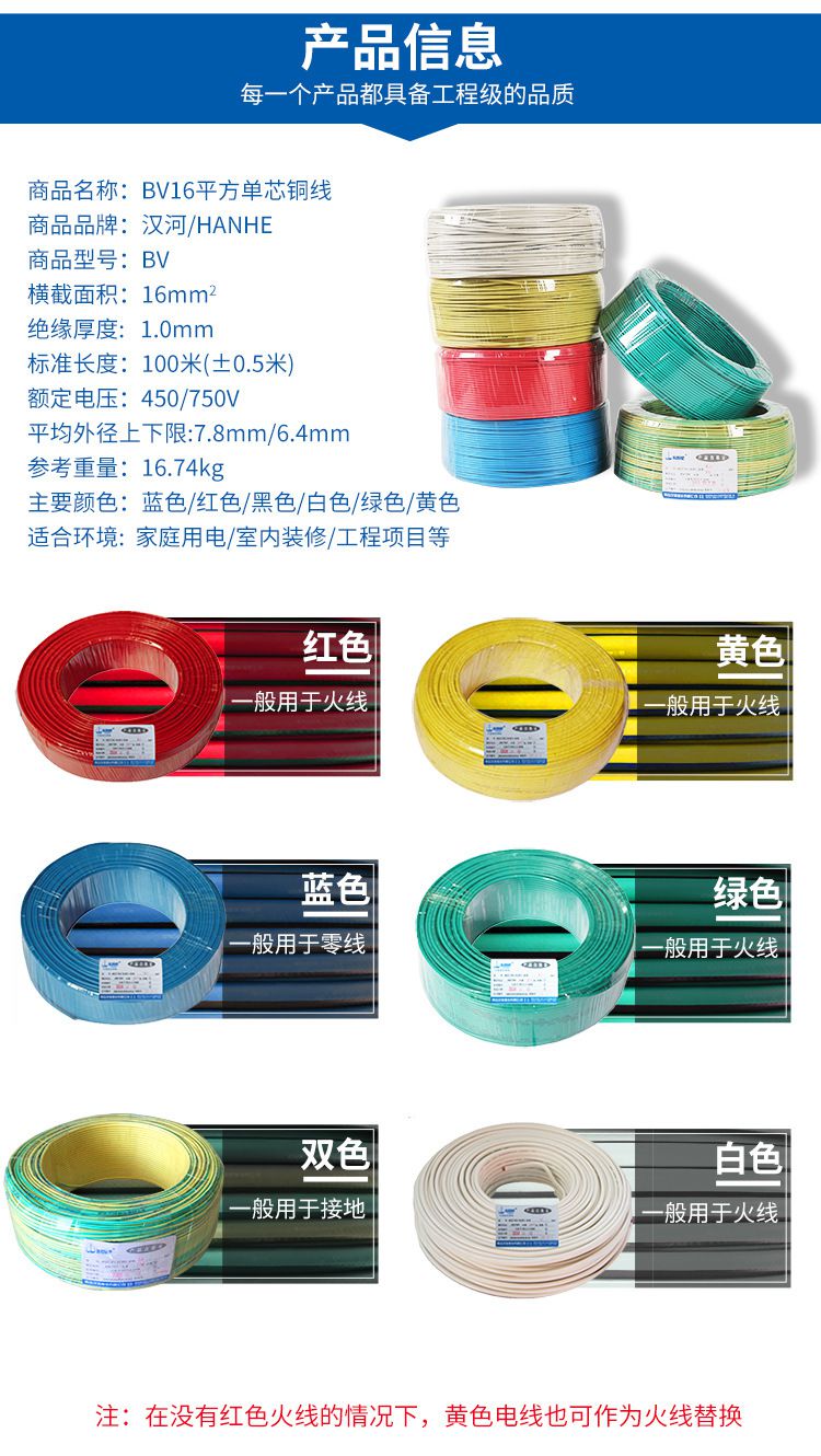 漢河電纜 BV16 平方國標銅芯家裝 單芯銅線 硬線 進戶總線